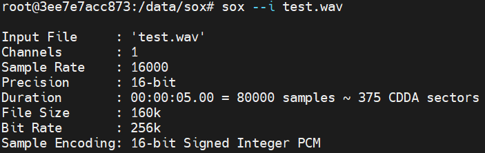 sox의 --i 옵션을 사용하면, 오디오 정보를 확인할 수 있습니다.