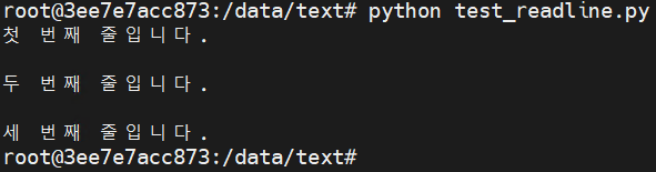 아래는 출력 결과입니다. readlines 함수를 사용했을 때와 동일한 출력이 나오는 것을 확인할 수 있습니다.