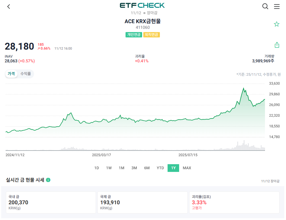 금 ETF를 하나 선택하면, 아래와 같이 실시간 금 시세와 금프 확인 가능합니다.