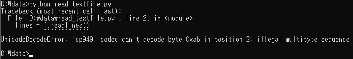 1. EEROR 발생Python에서 파일을 읽을 때, 아래와 같이 에러가 발생하였습니다. 2. 해결 방법UnicodeDecodeError는 파일의 인코딩 방식과 Python의 인코딩 설정이 맞지 않을 때 발생하는 에러입니다.둘 사이의 인코딩 방식 또는 설정을 맞춰주면 해결됩니다. 읽으려고 했던 파일의 인코딩 방식을 확인해보니 "UTF-8"이었습니다.이제 Python 코드에서 아래와 같이 인코딩을 지정해 주면, 에러 없이 잘 읽는 것을 확인할 수 있습니다.with open("test.txt", "r", encoding="UTF-8") as f: lines = f.readlines() for line in lines: print(line) 인코딩에 따라 다른 문자열로 읽어올 수 있으니..